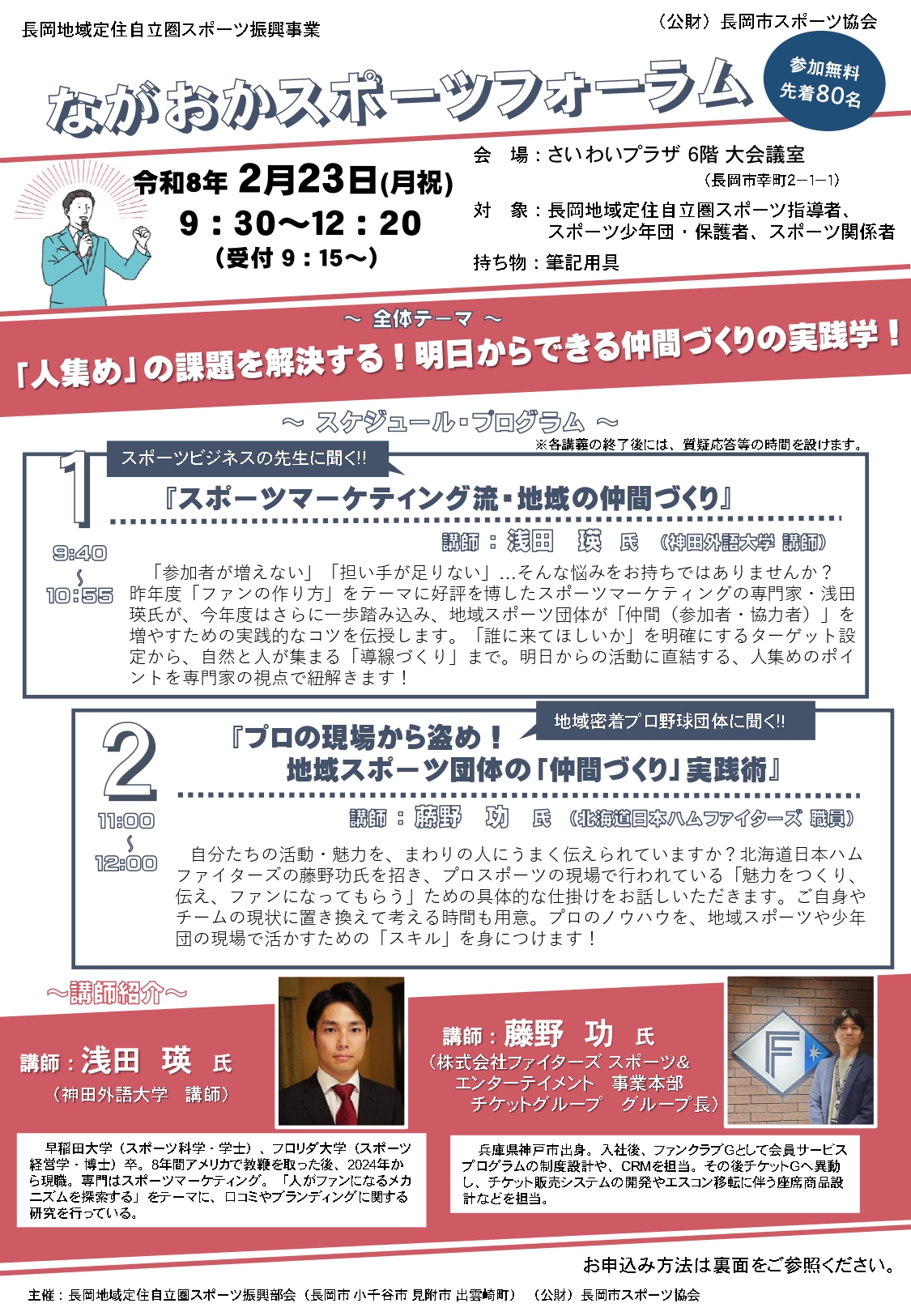 今回は、昨年度好評を博したスポーツマーケティングの専門家・浅田瑛氏に加え、地域密着の成功モデルである北海道日本ハムファイターズの藤野功氏の両名をお招きし、地域スポーツの現場における共通の課題である「人材確保」と「組織活性化」をテーマに、理論と実践の両面から、「参加者・担い手といった『仲間』をどう増やすか」「地域に愛される魅力をどう伝え、仲間(ファン)を作るか」等について解説いただきます。